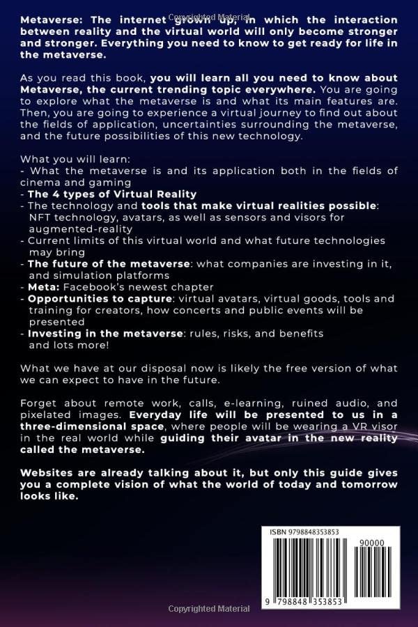 As you read this book, you will learn all you need to know about Metaverse, the current trending topic everywhere. You are going to explore what the Metaverse is and what its main features are. Then, you are going to experience a virtual journey to find out about the fields of application, uncertainties surrounding the metaverse, and the future possibilities of this new technology.